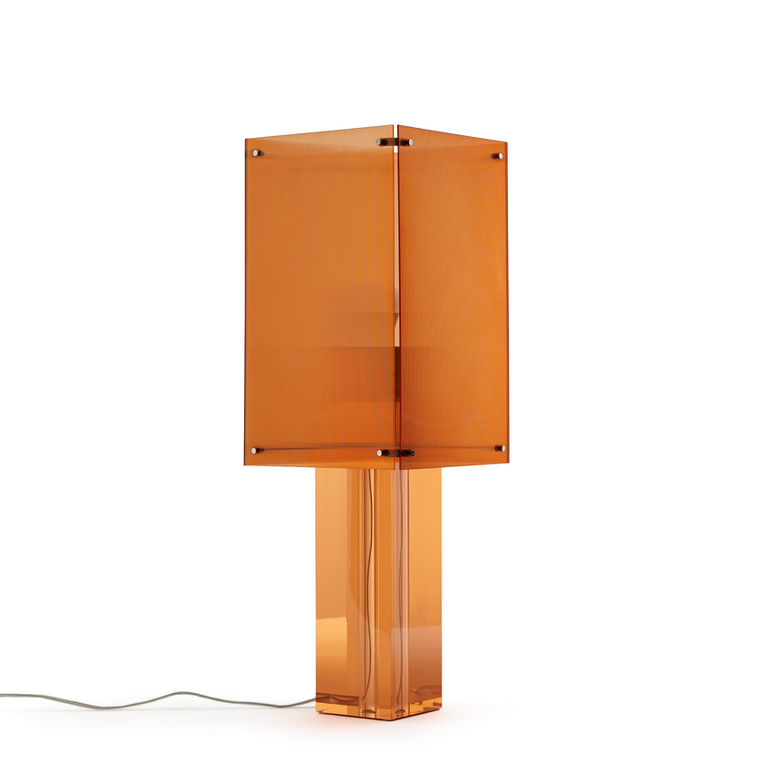 Akrilona d’inspiration seventies, la lampe Akrilona est un objet sculpture. La surface striée de l’abat-jour orangé diffuse une lumière d’ambiance diffractée, chaleureuse et légèrement scintillante.Ses quatre plaques translucides sont vissées sur un pied en acrylique ton sur ton, lisse et transparent. Idéale sur un buffet ou une console, une pièce contemporaine et décorative AMPM.